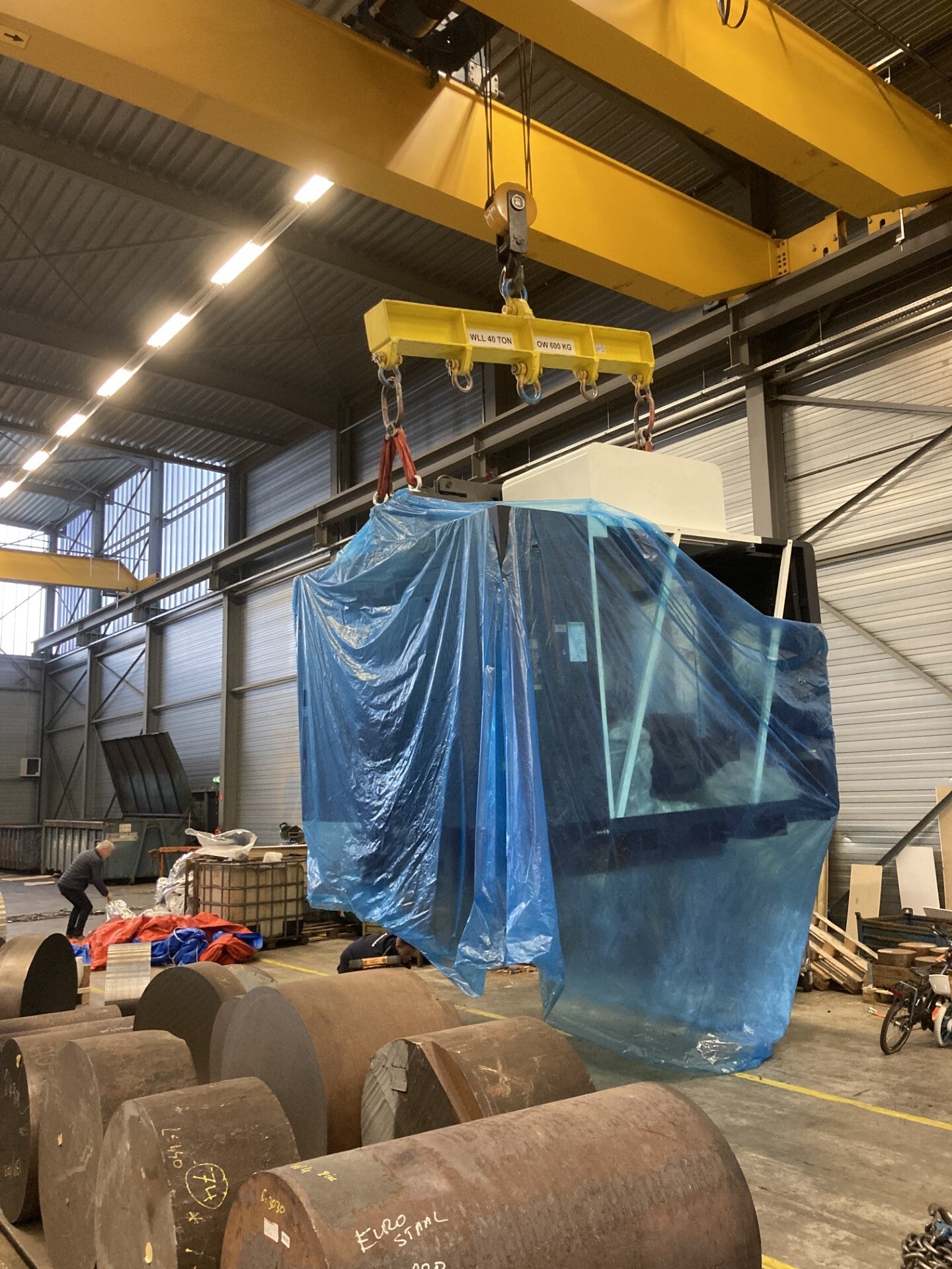 Robuuste Hyundai-Wia CNC draaimachine type L700MA met een eigen gewicht van 18.000 kg! Zware CNC draaimachine met behoorlijke afmetingen afgeleverd bij onze met behulp van zware kraan. Eerst werd de kraan goed gepositioneerd voor de overhead deur waarna de vrachtwagen met de machine tussen de roldeur en de kraan werd gereden. Vervolgens wordt de machine gehesen, waarna de vrachtwegen eronder weg rijdt! De machine wordt vervolgens op een zogenaamd Mover (tankset met accu-aandrijving) geplaatst waarmee de machine met behulp van radiografische afstandsbediening naar de stelplaats wordt gereden. Binnen 1 dag hebben we de machine vervolgens weer geïnstalleerd en in bedrijfgesteld!