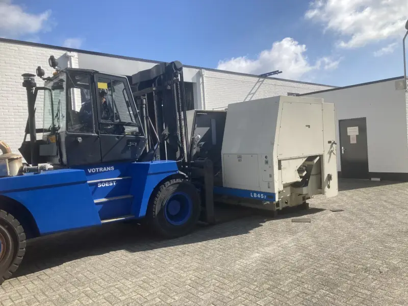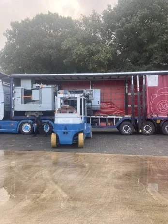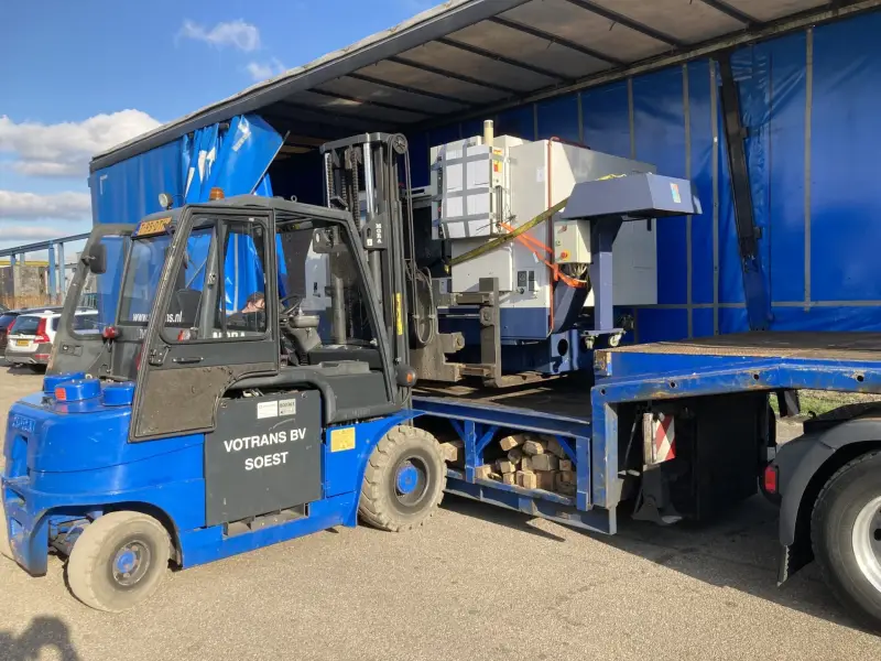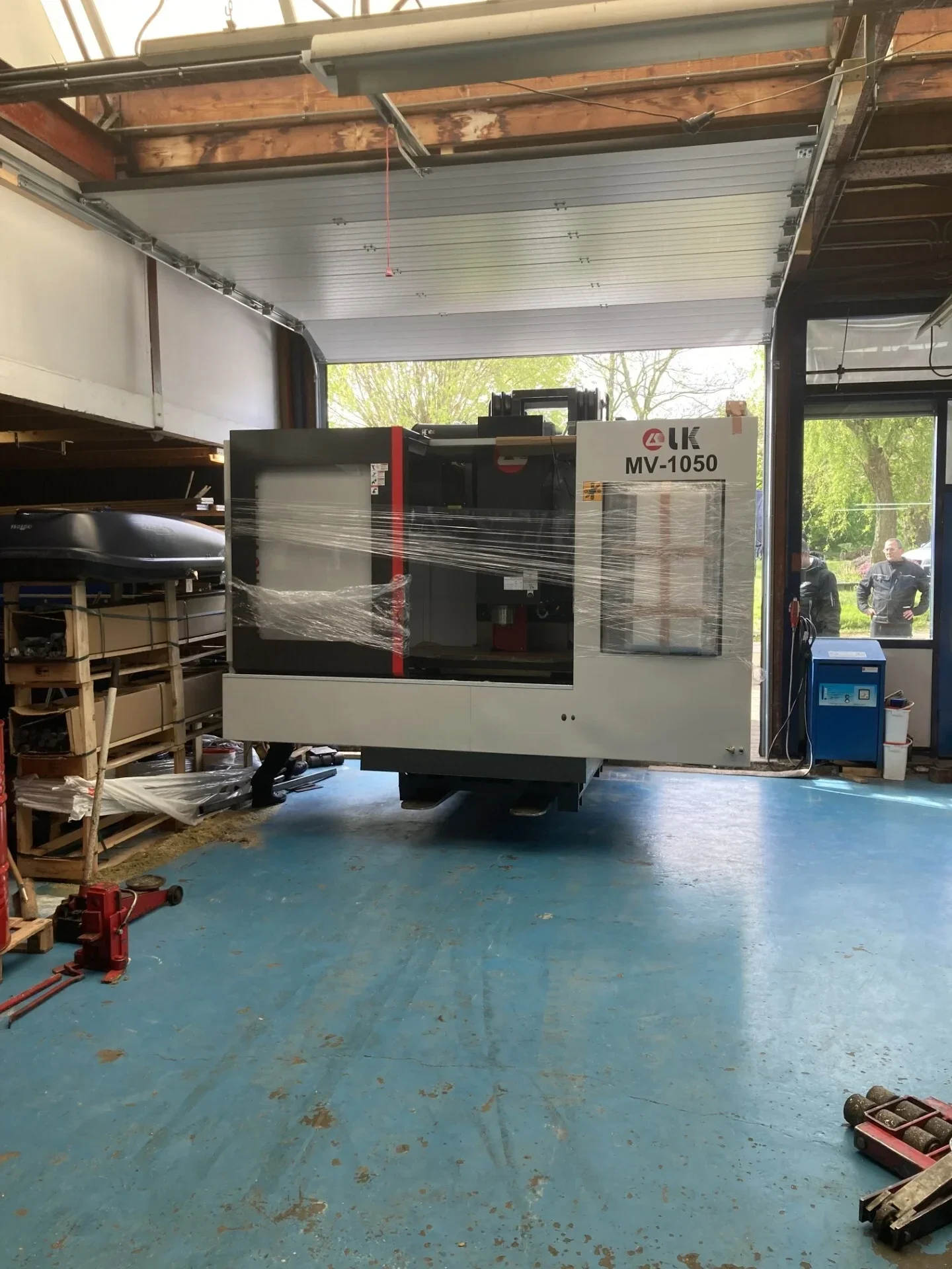 Het terrein voor het pand was voorzien van straattegels met zwakke onderbodem, zodoende hebben we het tegelpad naar het pand toe voorzien van 25 rijplaten welke 1.000 kilo per stuk wegen, maar zo zorgen we ervoor dat het terrein mooi vlak blijft. Tweede uitdading was de relatief smalle toegangsdeur. Aan beide zijden van de machine hadden we zo een 5 centimeter over.. Maar de stabiele 10 Tons heftruck stuurde het bewerkingscentrum haarscherp door de overhead deur! Onze klant heeft zijn tweede LK-MV-1050 aangeschaft. De machine staat inmiddels mooie producten te frezen!