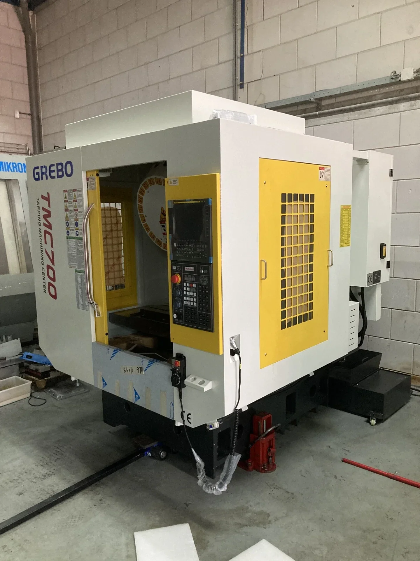Nieuw Grebo boor-, frees- en tapmachine type TMC-700. Mooi compact bewerkingscentrum met een X-, Y- en Z-as beweging van 700 x 420 x 300 mm en een direct drive spindel met een maximaal toerental van 12.000 omw./min. De machine is voorzien van een zogenaamde turret die razendsnel kan wisselen met 21 gereedschapposities. Eigen gewicht machine bedraagt 3.400 kg. Met de heftruck binnen gezet en vervolgens op de tankset naar de uiteindelijke stelplaats.