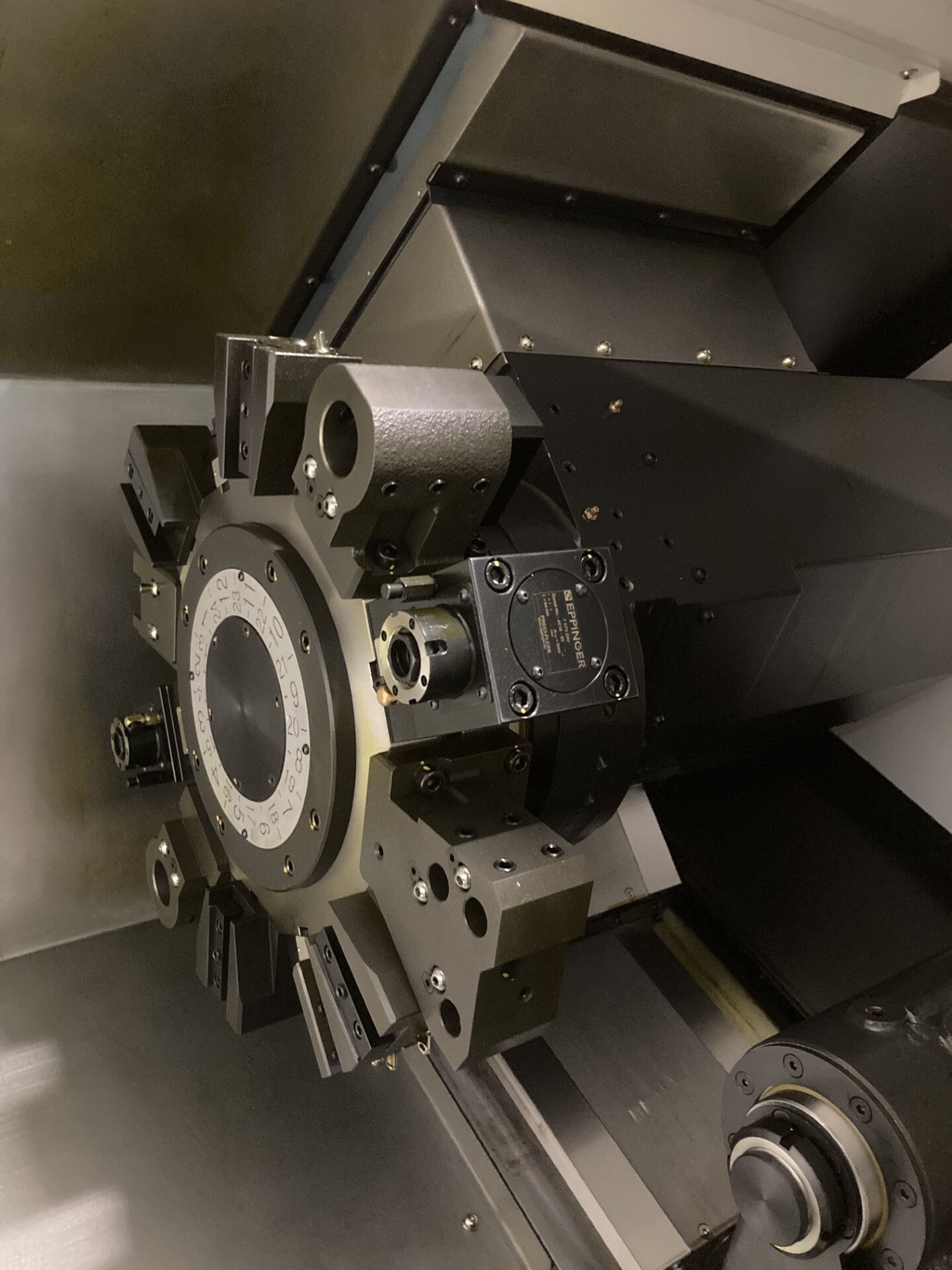 Afgeleverd: Doosan cnc draaimachine type TT1800SY. Zeer productieve cnc draaimachine met 2 gelijke spindels met 65 mm stafcapaciteit en boven- en onderturret met 12 posities en tussenposities. Op alle posities kan je aangedrreven gereedschaphouders kwijt. Uitgevoerd met automatische werkstukafvoerband en LNS stafmagazijn type Quick Load Servo III.
