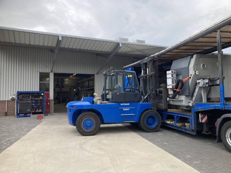 Geleverd! Haas VF-6B!! Machine met een eige machinegewocht van ruim 10 Ton peuleschil voor 17 tons heftruck!