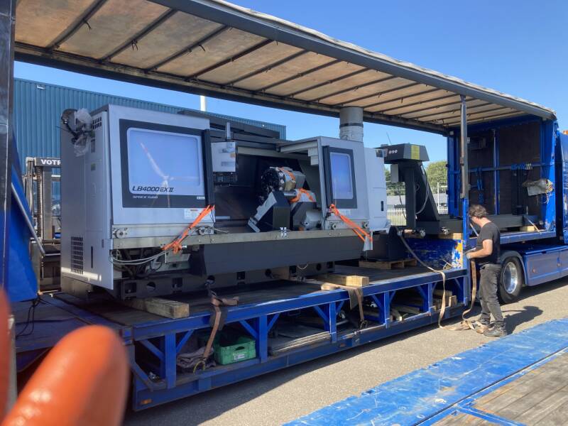 Afgeleverd: Robuuste Hyundai-Wia CNC draaimachine type L700MA met een eigen gewicht van 18.000 kg! Zware CNC draaimachine met behoorlijke afmetingen afgeleverd bij onze met behulp van zware kraan. Eerst werd de kraan goed gepositioneerd voor de overhead deur waarna de vrachtwagen met de machine tussen de roldeur en de kraan werd gereden. Vervolgens wordt de machine gehesen, waarna de vrachtwegen eronder weg rijdt! De machine wordt vervolgens op een zogenaamd Mover (tankset met accu-aandrijving) geplaatst waarmee de machine met behulp van radiografische afstandsbediening naar de stelplaats wordt gereden. Binnen 1 dag hebben we de machine vervolgens weer geïnstalleerd en in bedrijfgesteld!