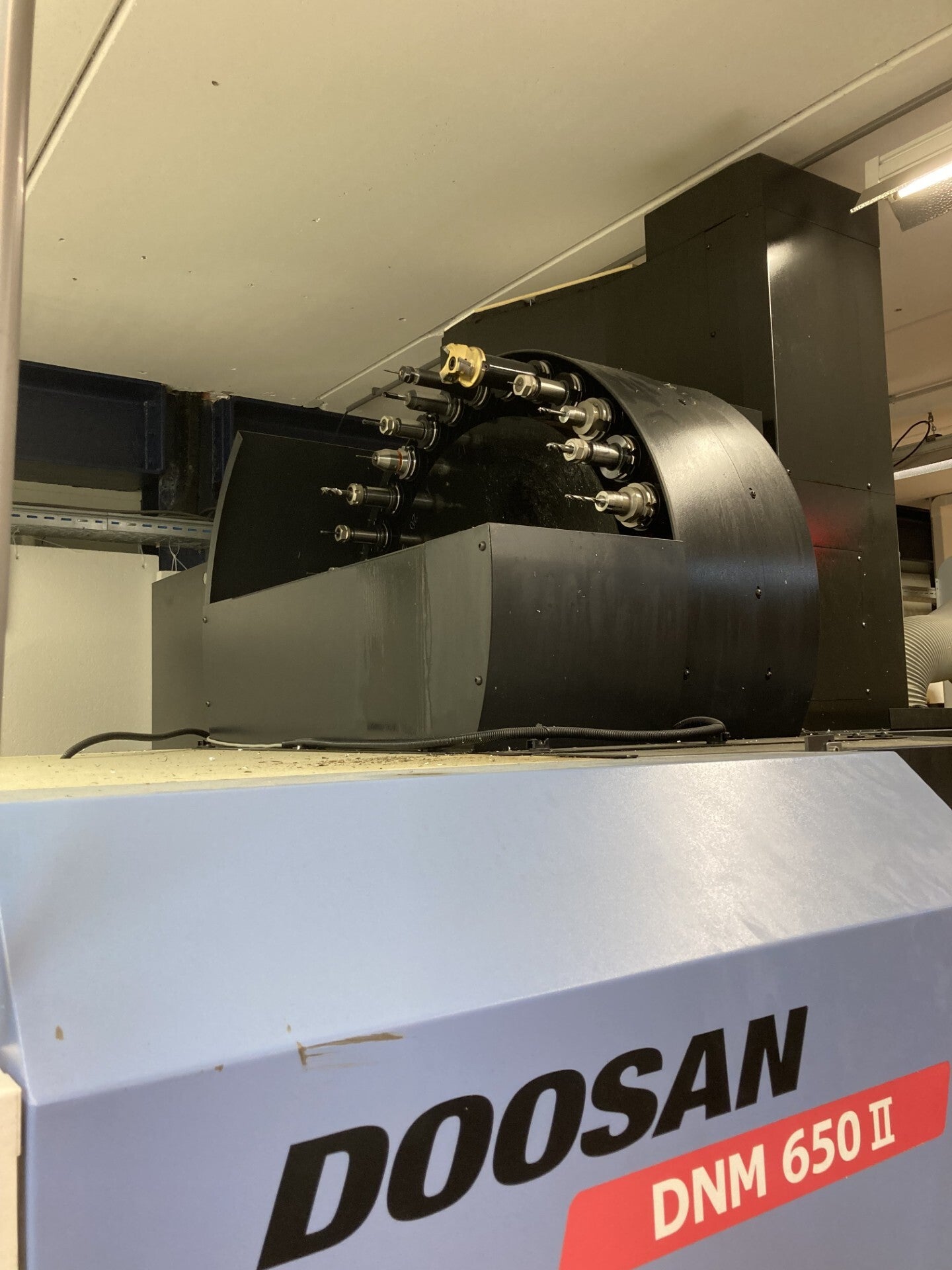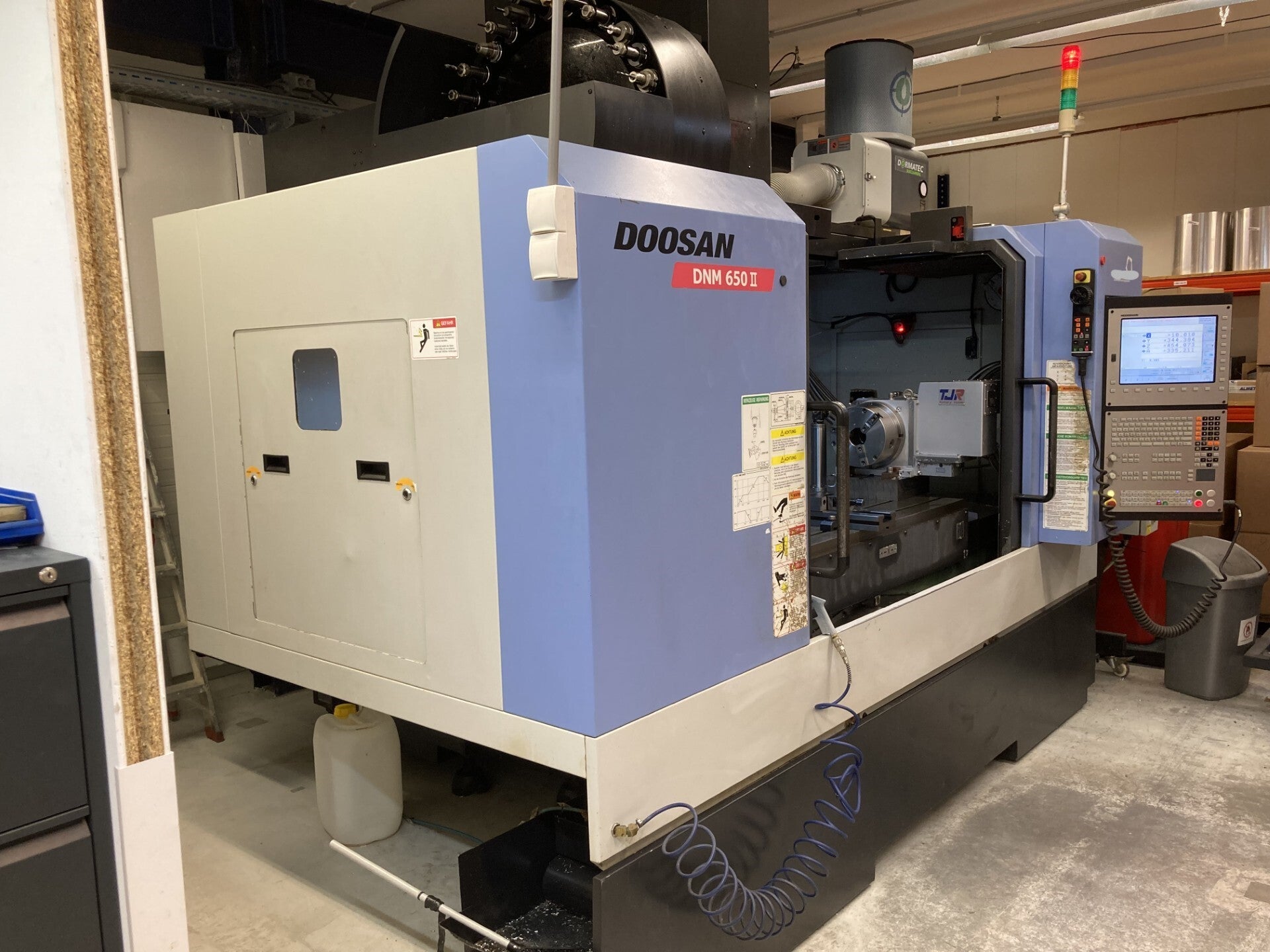 Te koop: Een in zeer goede staat verkerend Doosan vertikaal bewerkingscentrum type DNM-650 II uitgevoerd met de beproefde Heidenhain TNC 530i besturing. Dit ruime bewerkingscentrum met een X-, Y- en Z-as verplaatsing van 1.270 x 670 x 625 mm en een tafelgrootte 1.300 x 670 mm geeft uitstekende mogelijkheden meer of grotere producten te bewerken. Verder is de machine uitgerust met koeling door de spil, een complete vierde as, welke is voorzien van een handbediende klauwplaat met een diameter van 250 mm. Verder heeft de machine een arm type gereedschapwisselaar met 30 posities, een scharnierband spanentransporteur met rechtse uitwerp, enz. Voor meer informatie, mail naar chris@machinematch.nl