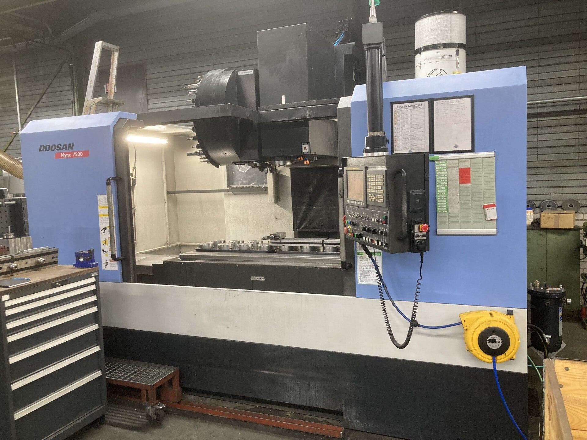 Te koop: Krachtig Doosan vertikaal bewerkingscentrum type Mynx 7500/40. Uitgevoerd met de bekende Fanuc i serie besturing inclusief Fanuc Manual Guide i dialooggedeelte. Dit model met een een eigen gewicht van 13.500 kilo heeft een X-, Y- en Z-as verplaatsing van resp. 1.525 x 762 x 625 mm. De tafelgrootte bedraagt 1.600 x 750 mm. De machine is volledig voorzien van blokgeleidingen. De spilopname betreft een ISO 40 opname. De machine heeft een zogenaamde armwisselaar met 32 posities en is tevens voorzien van koeling door de spil. Als extra is de machine voorzien van een geïntegreerde Nikken complete vierde as met tegencenter. Ook beschikt de machine over een spanentransporteur met rechtse uitwerp. Indien gewenst kunt u extra gereedschaphouders bij de machine bijkopen. De machine bevindt zich in een uitstekende staat en Voor meer informatie, stuur een mail naar chris@machinematch.nl