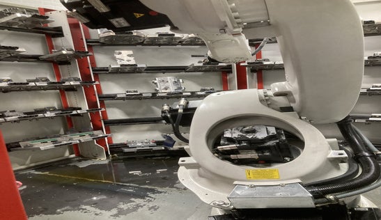 De machine is gekoppeld aan een robotbeladingssysteem met meerdere palletposities (afhankelijk van palletgrootte). Hiermee beschikt u over een compleet geautomatiseerd bewerkingssysteem voor onbemande productie.